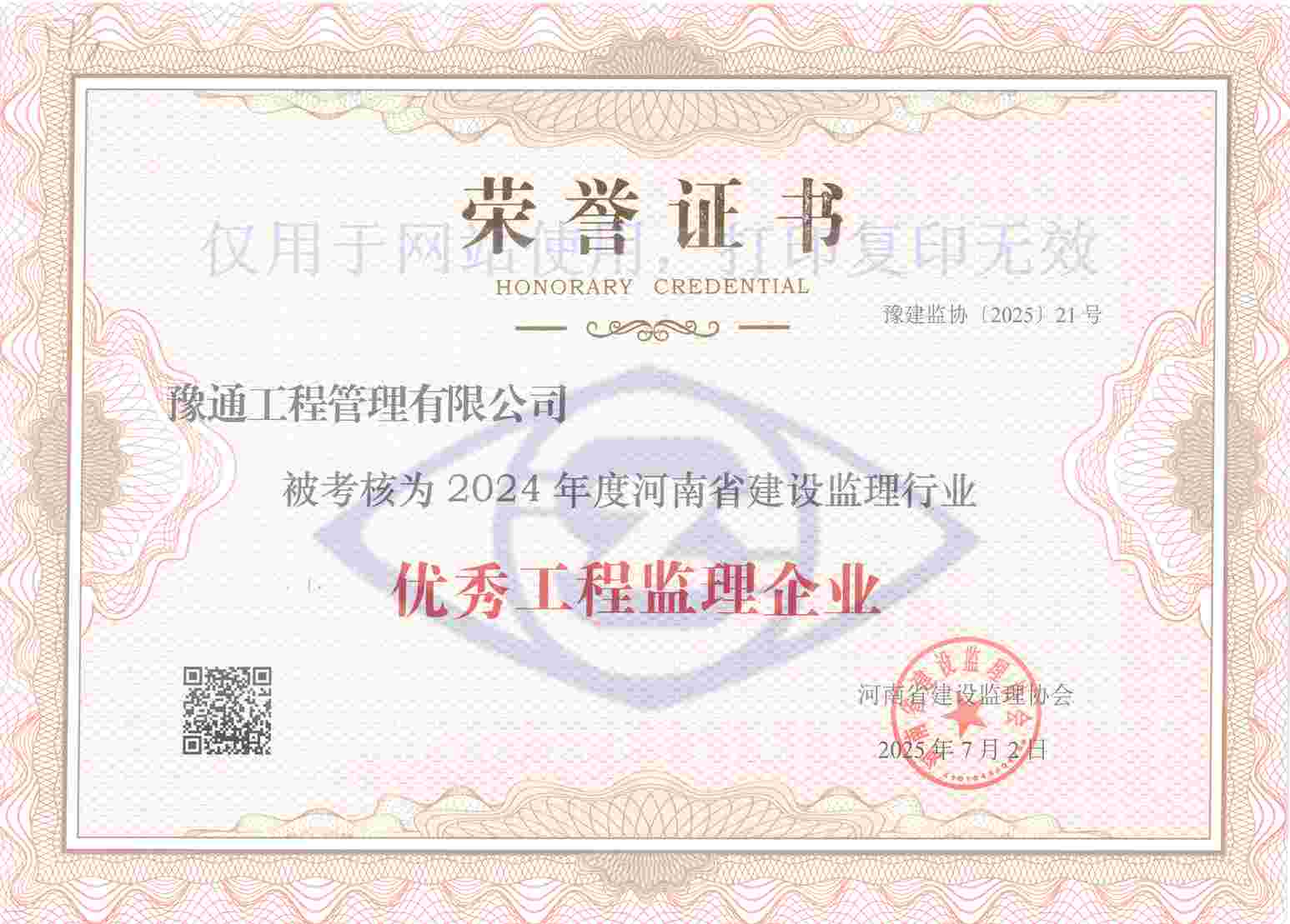 近日,河南省建設監(jiān)理協(xié)會發(fā)布了《關于公布2024年度會員單位和從業(yè)人員考核結果的通知》,我公司榮獲“2024年度優(yōu)秀工程監(jiān)理企業(yè)”稱號。